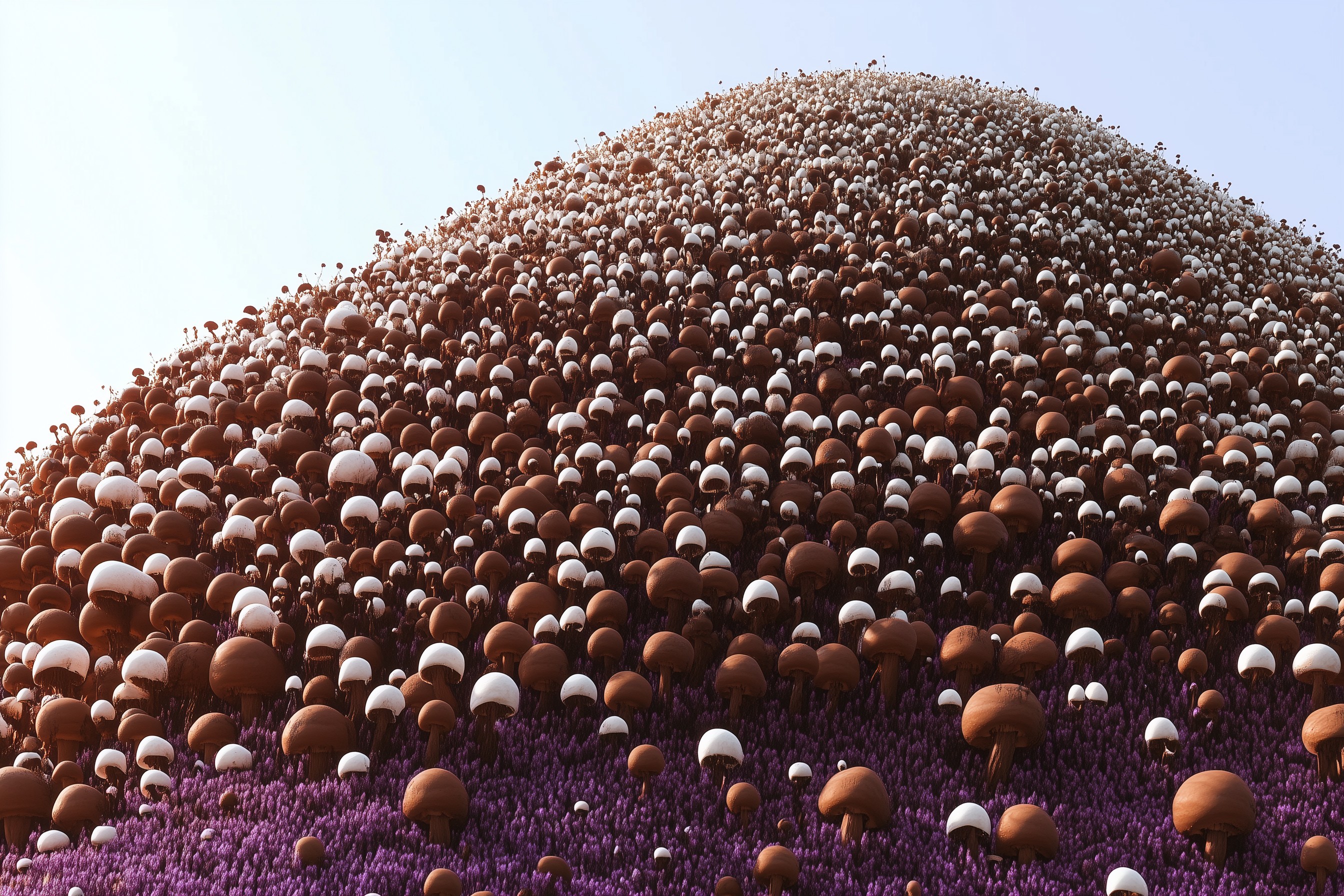 The first one, around the time when Adam’s voice woke me up, was very beautiful though. There was a hill that was completely covered with mushrooms, seen from an aerial point of view. Their caps were brown instead of red, but spotted, recalling the fly agaric, and they had bulbous rounded tops which were squished together as tight as tiles. I wasn’t in this dream but the view of it was from the sky, and above the hillside of mushrooms was lavender-colored fog through which the vantage point looked over everything.